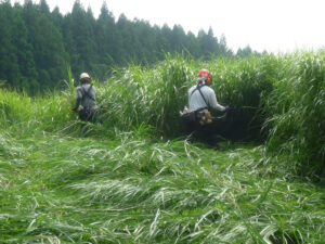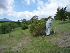 毎年、演習場に杉を植林しています。下刈り作業とは、杉の成長を妨げないように周りの草を刈ることをいいます。